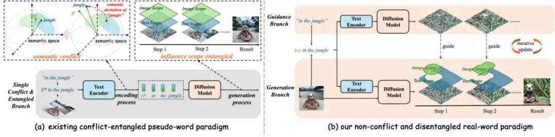 现有范式将主体表示为一个伪词(例如),并将其与文本结合用于生成。伪词本身存在固有冲突(即,会导致其他真实词语偏离其原有语义)和纠缠(即,影响范围与文本有重叠),从而产生了双最优悖论:主体相似性与文本可控性之间存在权衡。