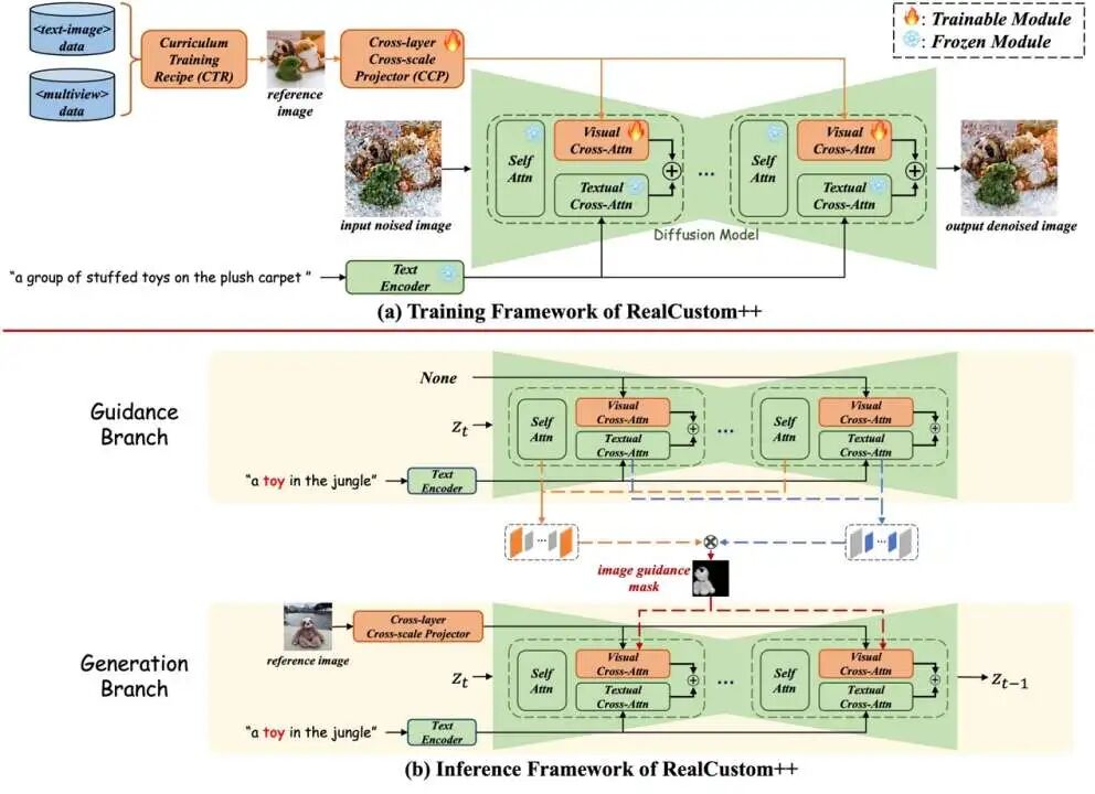 本文提出了RealCustom++这一创新定制范式,首次通过真实词汇无冲突地表征主体,实现了主体相似性与文本可控性的精准解耦。该范式通过训练-推理解耦框架内的渐进式定制过程,将目标真实词汇从通用概念逐步细化为具体主体。RealCustom++采用跨层跨尺度投影器与渐进式课程训练策略,实现了鲁棒的特征提取及姿态与尺寸的多样性。在推理阶段,自适应掩码指导技术能准确定制目标真实词汇,同时有效保留主体无关区域。我们进一步通过多真实词汇定制算法将RealCustom++扩展至多主体场景。大量实验表明,该方法在单主体与多主体的实时开放域定制任务中,在主体相似性与文本可控性方面均达到了最先进的性能水平。