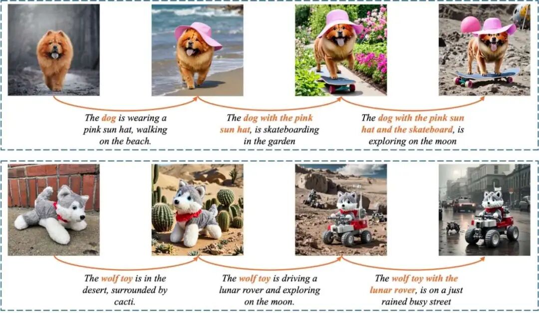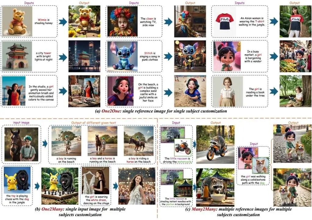 突破传统方法存在的主体一致性和文本可控性之间的权衡取舍问题,创新性地将参考图主体表征为真实文本单词,通过解耦文本和参考图的影响区域,同时实现高度主体一致性和文本可控性;
