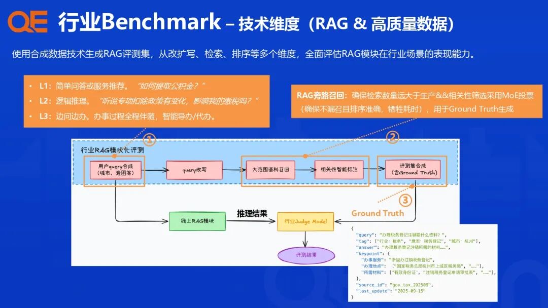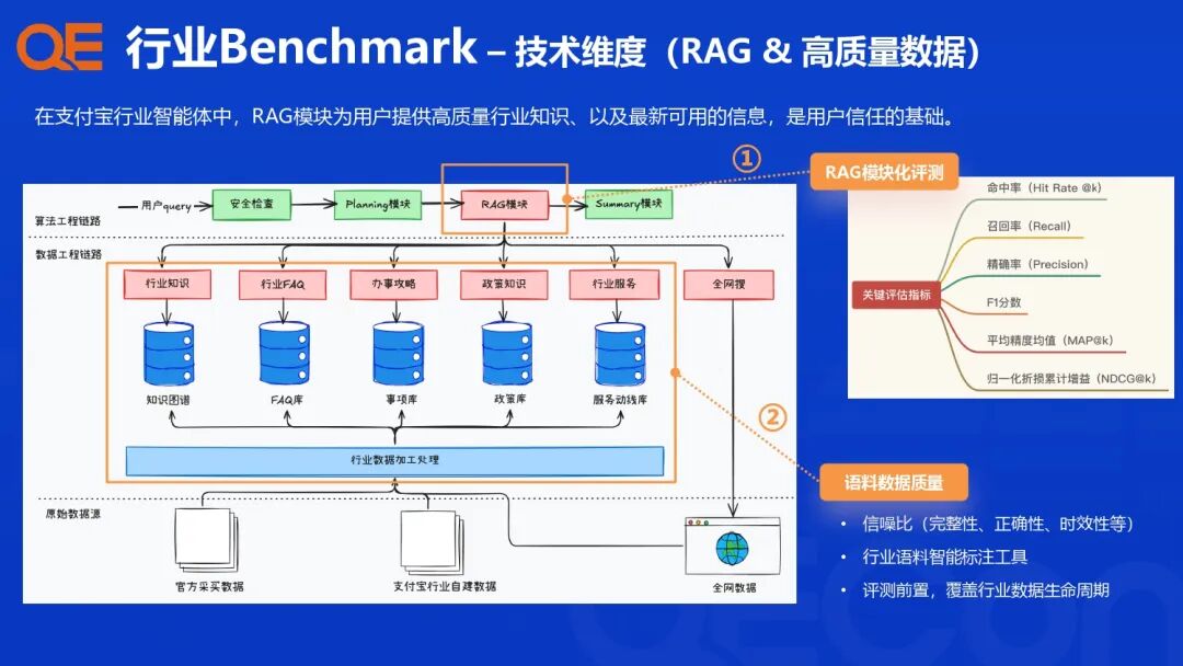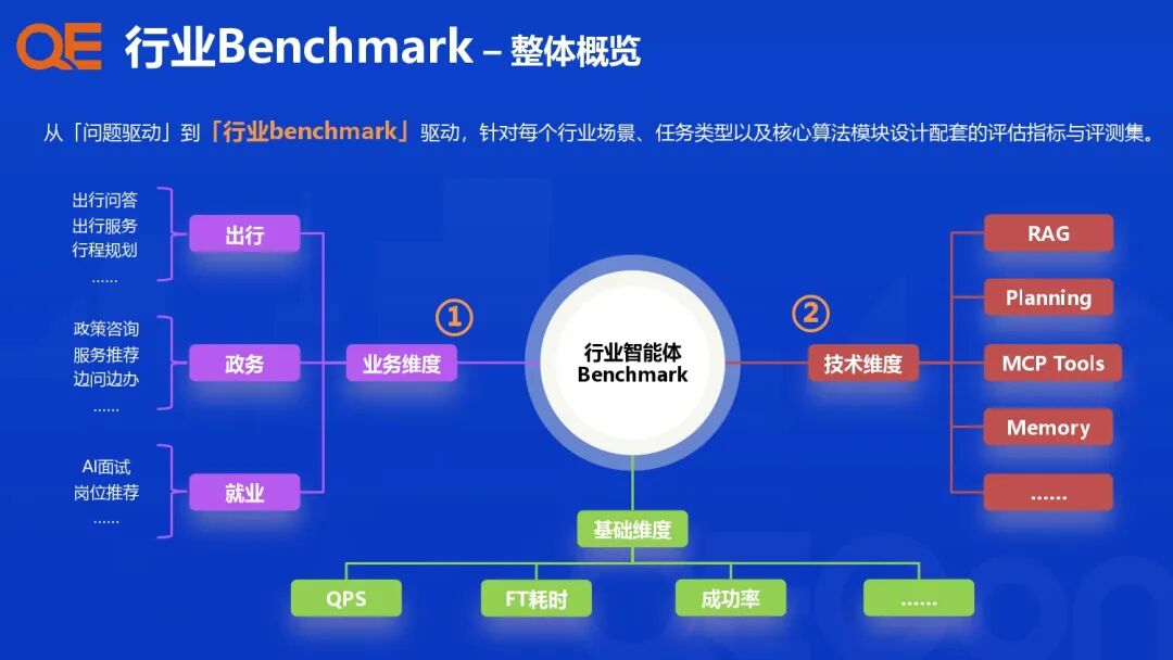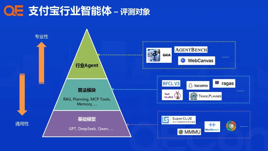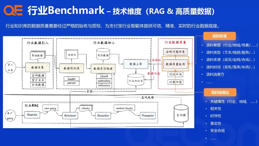 支付宝的行业智能体评测体系建设,其核心理念是从传统的“问题驱动”升级为“行业 Benchmark 驱动”,针对各个行业场景、任务类型和核心算法模块,设计配套的评估指标与评测集,构建一个多维度、高效能的评测闭环。