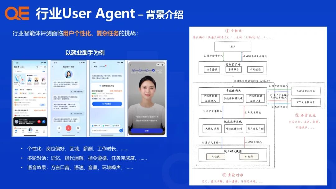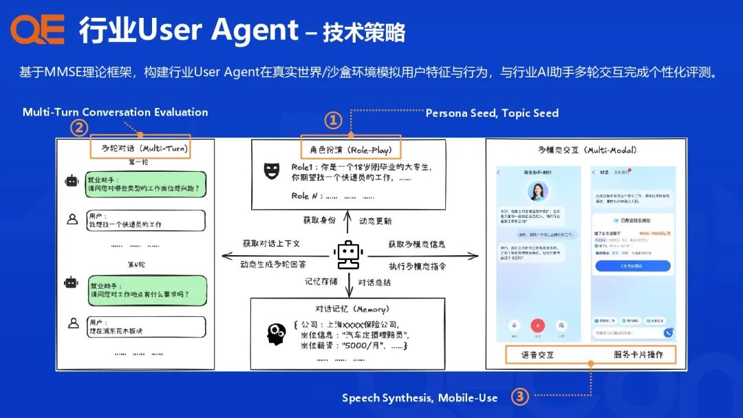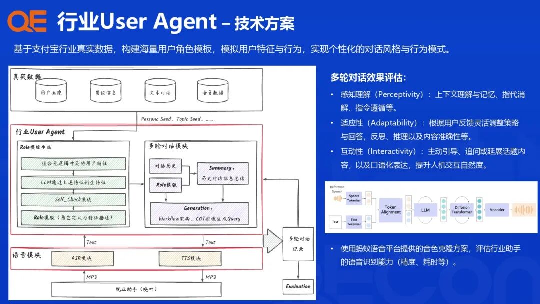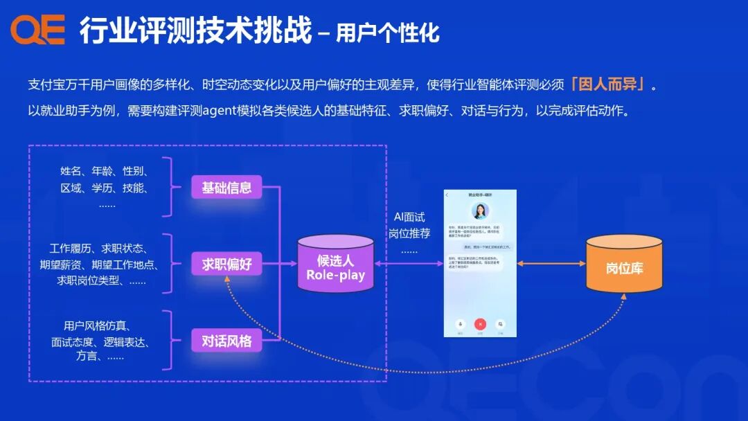 为了解决用户个性化和复杂多轮任务的挑战,支付宝构建了行业 User Agent,用于在真实世界或沙盒环境模拟用户特征和行为,进行个性化评测。