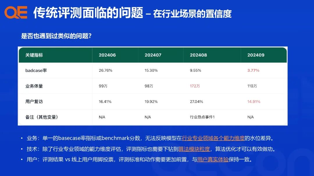 用户层面: 评测结果与线上用户的真实“用脚投票”存在差距。评测的标准和动作需要更加前置,并与用户的真实体验保持高度一致。
