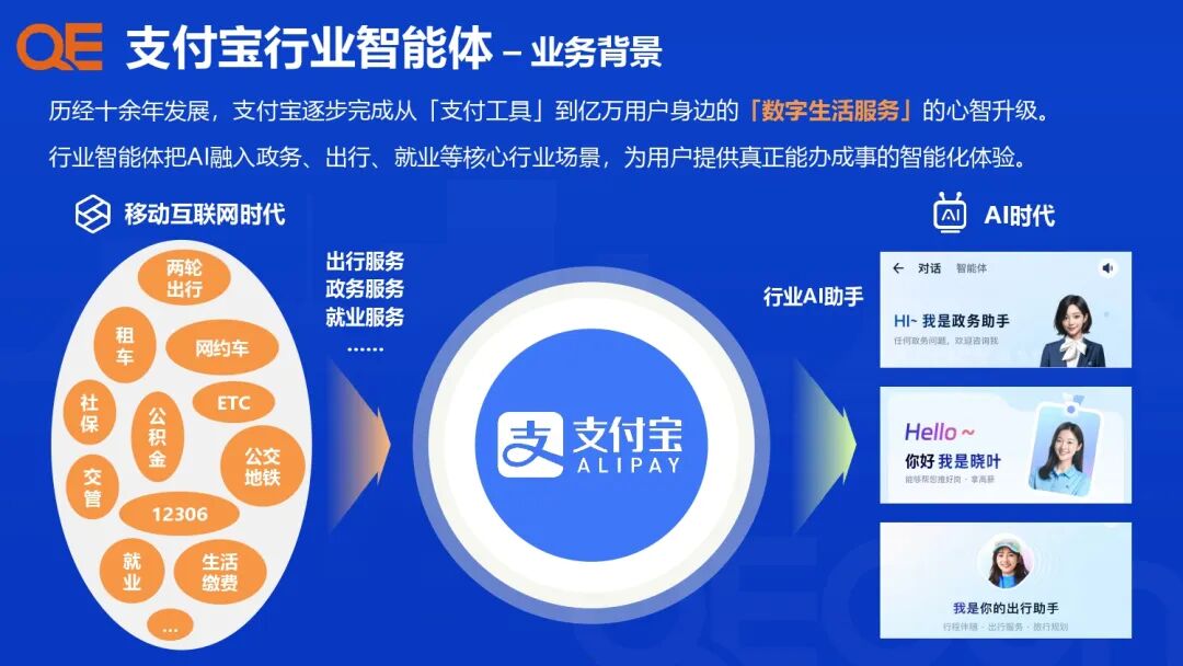 支付宝经过十余年的发展,已经完成了从单一的“支付工具”到服务亿万用户的“数字生活服务”平台的升级。在AI时代,支付宝正积极推进行业智能体(Industry Agents)的建设,旨在将人工智能深度融入到政务、出行、就业等核心行业场景中,为用户提供真正能“办成事”的智能化体验。
