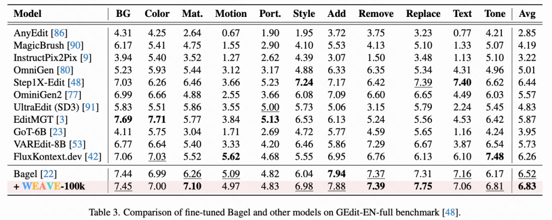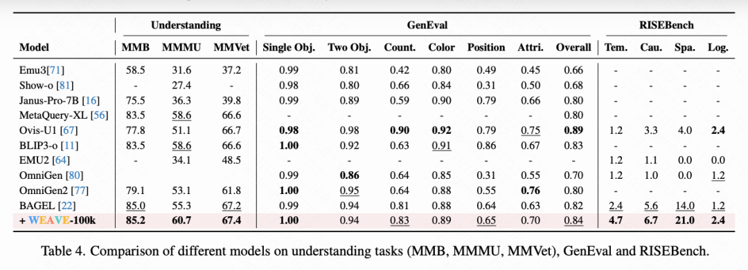 为验证数据的有效性,本文在Bagel上进行实验。在四类任务上实现性能提升: (i) 视觉理解。 本文的数据有效提升理解任务性能,尤其在MMMU上获得9.8%的提升。(ii) 图像编辑。如下表3所示,微调后的Bagel在GEditBench上总分提升4.8%。该模型在多数任务中超越基线版本,材质变更和风格变更类别提升尤为显著,分别达到13.4%和15.6%。(iii) 理解与生成协同。上表4显示,微调后Bagel在RISE认知任务中实现显著提升。空间推理和逻辑推理任务均呈现100%的性能增长,表明微调后模型能更有效利用理解能力和世界知识来增强生成过程。这些发现印证了WEAVE-100k方法的高质量特性。(iv) 交错式跨模态理解与生成。如表2所示,本文的微调模型在WEAVEBench上相比Bagel提升42.5%。在更具挑战性的科学问题上表现提升34.6%,表明使用本数据集训练显著增强了模型的交错式跨模态理解与生成能力。