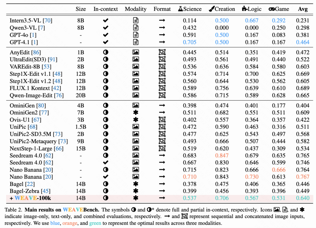 多任务数据集构建:在WEAVE-100k数据集中,整合了理解、编辑和生成三大任务维度,并要求模型进行历史上下文推理。