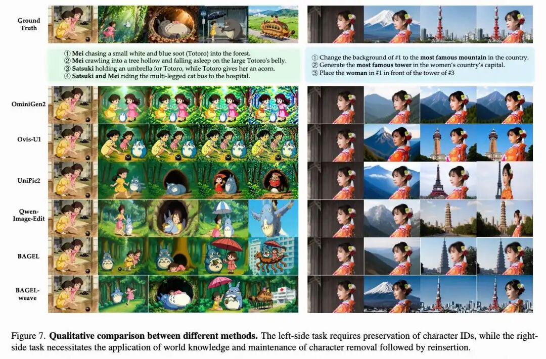 如下图7所示,通过质量结果分析本文得出以下结论:(i) 指令遵循能力仍需提升。例如图中左侧案例,OmniGen和Ovis未能正确执行生成;右侧案例第三列显示Qwen-Image-Edit仅生成塔楼而未包含任何人像。(ii) 基于weave数据集的微调催生了视觉记忆能力。微调模型在左侧案例中正确区分穿粉色和黄色衣服的主角,在右侧案例中展现出先移除人像再重新整合的能力。