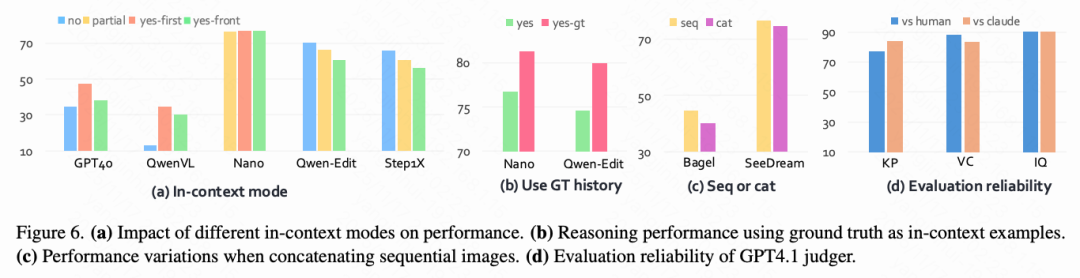 上下文使用至关重要 (a) 对于理解任务,使用上下文信息相比无历史上下文的基线条件带来显著性能提升。如下图6(a)所示,QwenVL表现出163%的显著提升,表明WEAVEBench成功将历史信息纳入模型评估。(b) 对于生成任务,增加上下文内容对不同模型类型产生分化效应。开源模型随着历史上下文增加出现性能逐步下降——Qwen-Edit分别出现5.3%和8.6%的性能递减。这表明受单轮编辑能力限制的开源模型,在处理扩展上下文信息时定位精度下降,因而无法有效利用上下文数据。相反,Nano等闭源模型表现出渐进式改进,表明其成功利用了上下文信息。(c) WEAVEBench展现优异图像质量。如下图6(b)所示,采用WEAVEBench真实图像作为上下文示例使所有模型性能提升。值得注意的是,Qwen-Image-Edit表现出7.1%的显著提升,这可能源于其生成能力相对nano-banana[21]固有较弱。