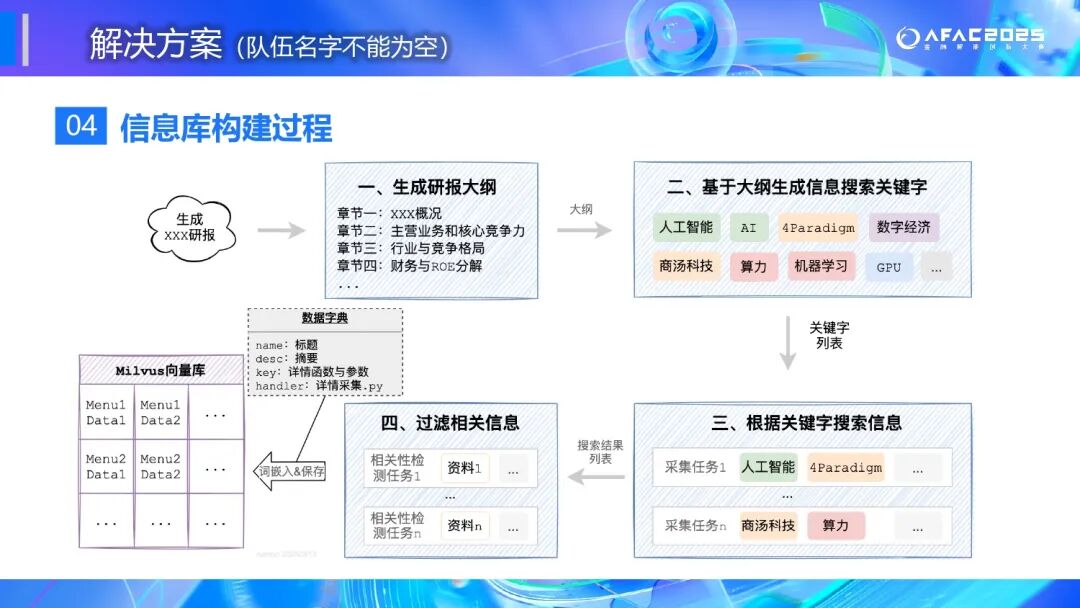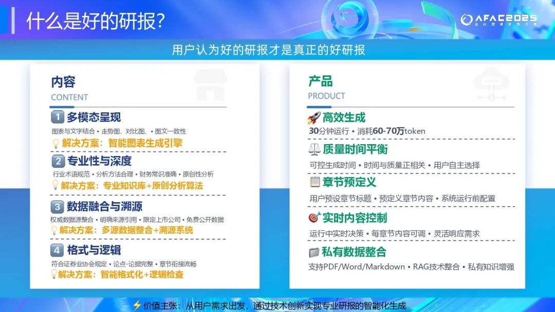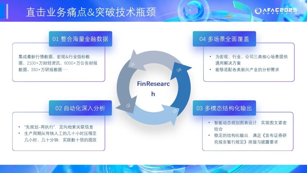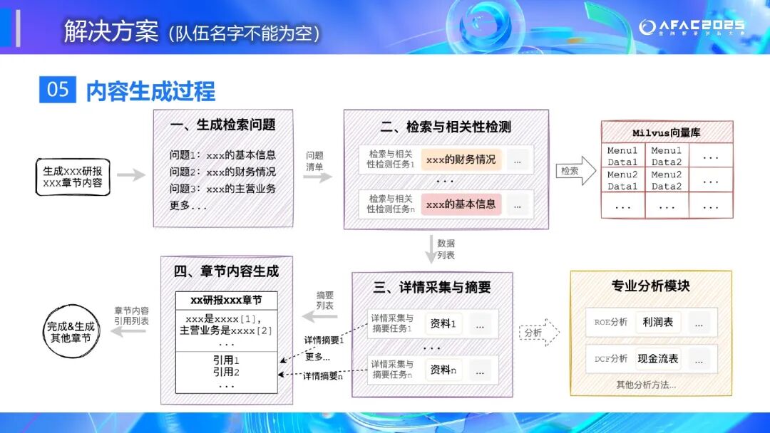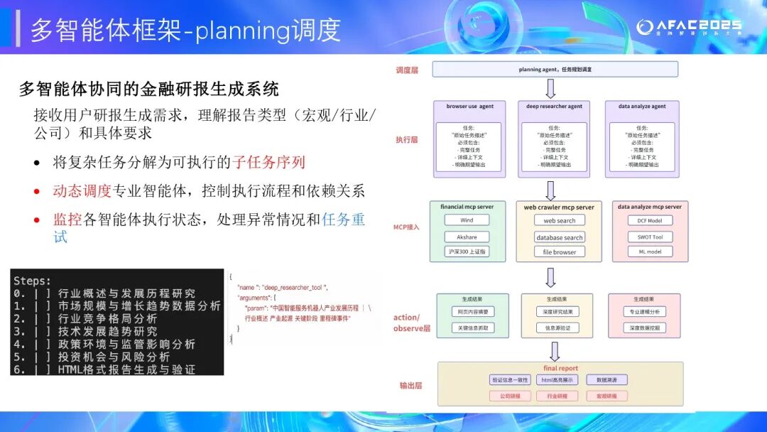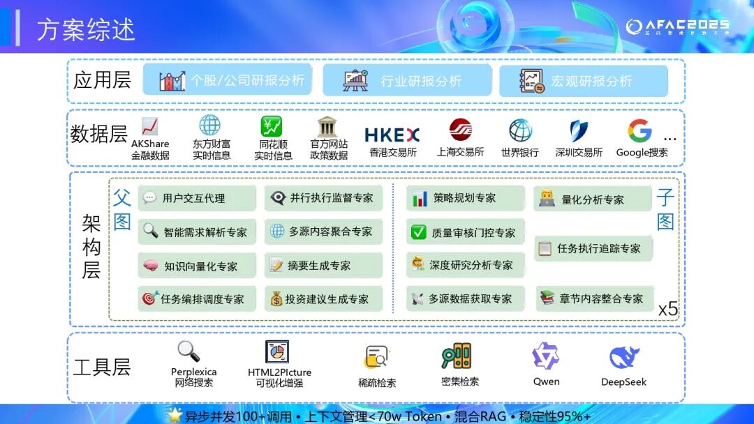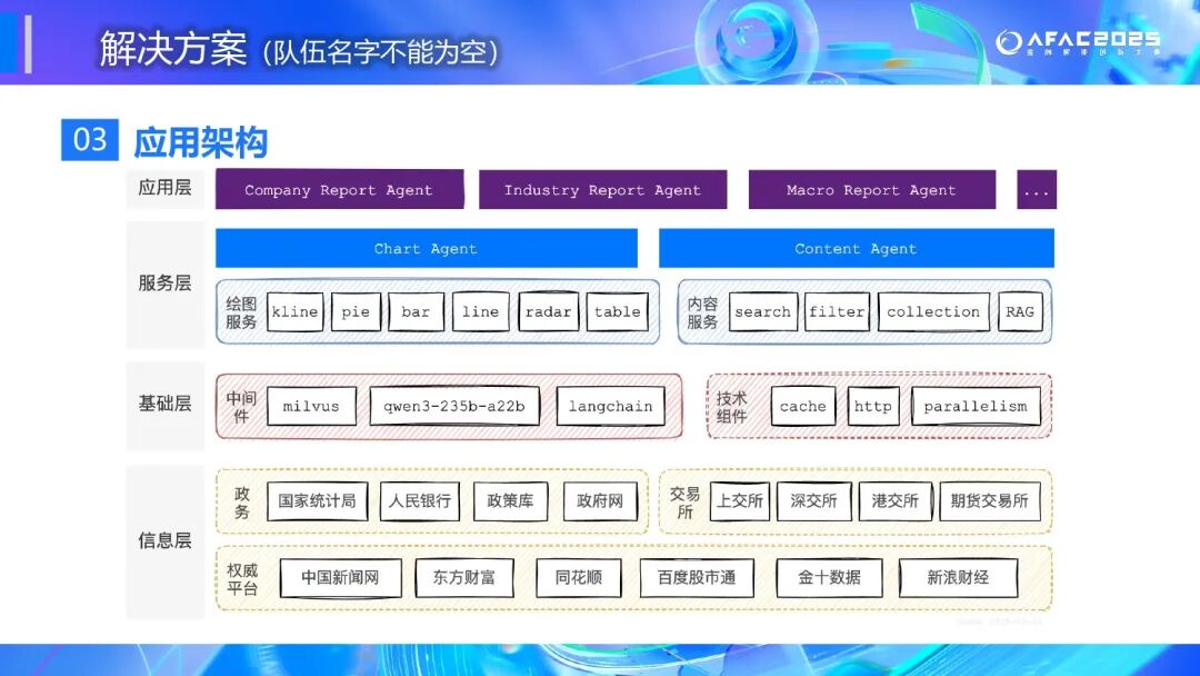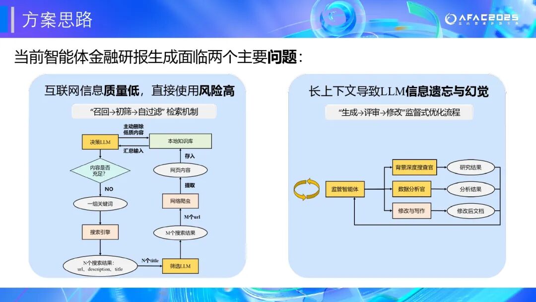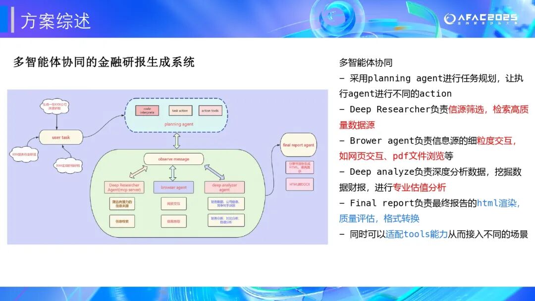 本任务致力于解决通用预训练大模型财务分析能力缺失、信息获取与整合不足以及大模型幻觉与结构化输出困难三大核心问题,通过引入Agent系统、检索增强生成(RAG)技术、工具库、模型上下文协议(MCP)以及Agent2Agent(A2A)协议等前沿技术,提升大模型在金融场景中的可用性,实现自动化生成具有决策价值的专业研报。