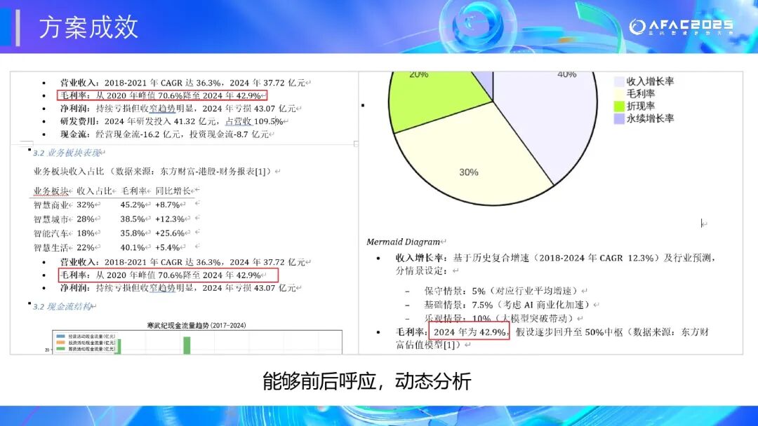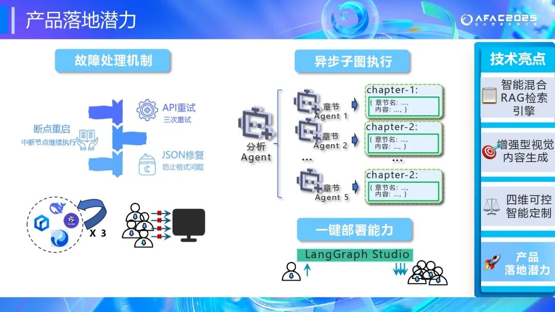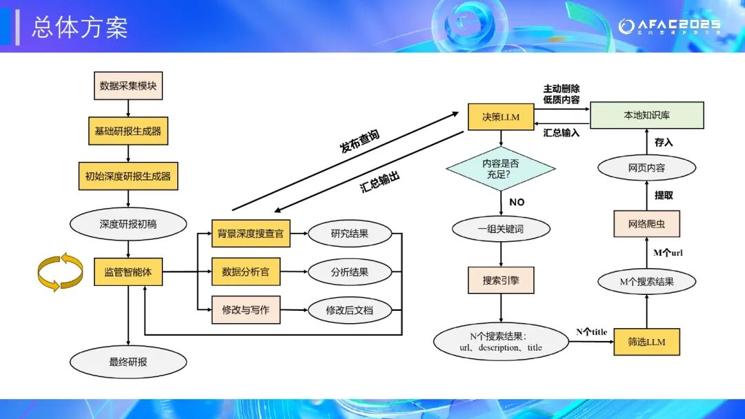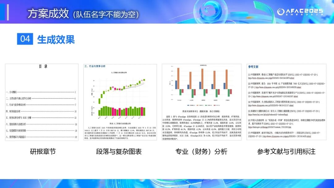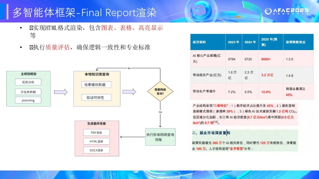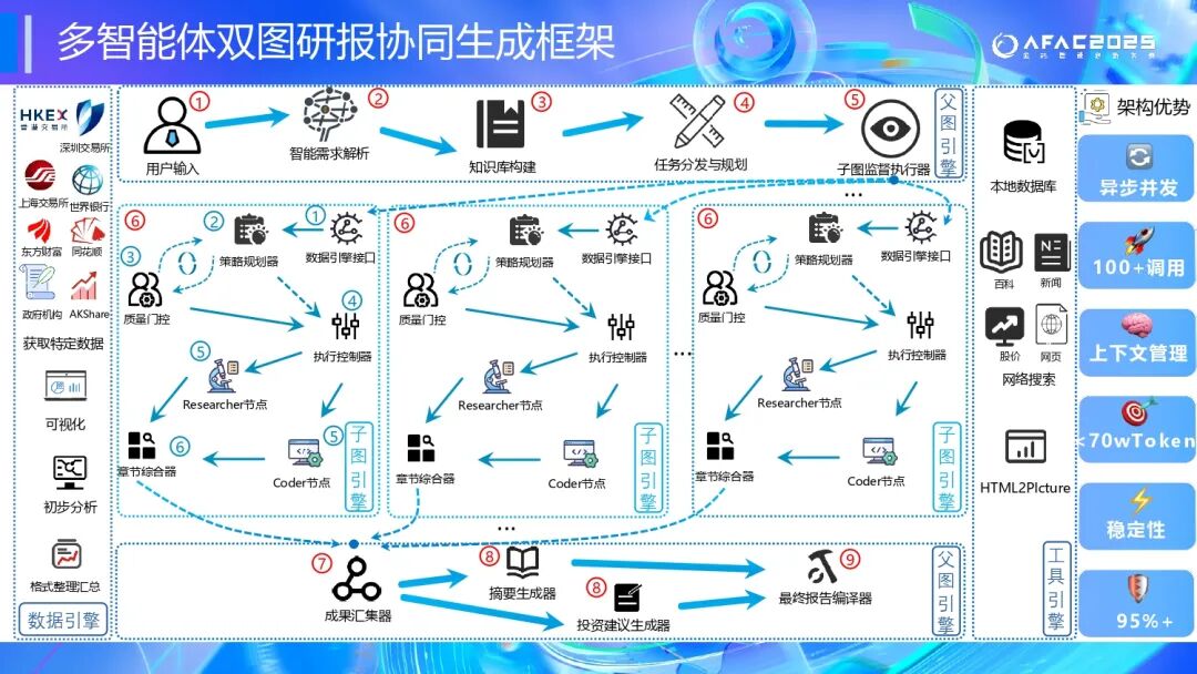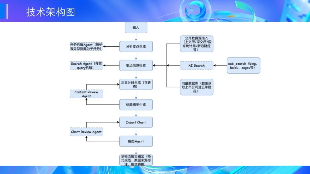多Agent协同:通过多Agent分工与链式推理完成端到端流程,自动拆解任务并分阶段调用功能模块(如信息检索、图表生成、内容撰写与审查),包含自检与反馈循环;