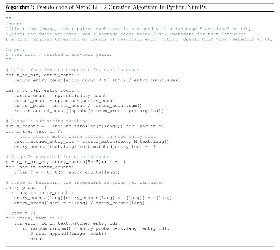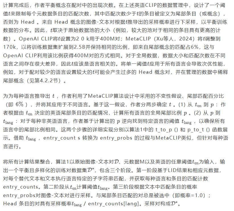 接下来,作者将数据策展扩展到全局范围,按语言逐个进行。数据策展算法的详细描述如下,并以伪代码形式总结为算法1。首先,作者进行语言识别(LID)(Grave等人,2018),用于对图像-文本对中的替代文本进行语言分类,并选择特定语言的元数据以匹配概念。LID覆盖的语言集合和元数据来源(例如维基百科)通常不同,因此作者首先建立LID中的一种语言与元数据条目中唯一语言集合之间的映射。映射到LID中相同语言的元数据被合并为一组。最终得到元数据M的字典表示,其中键是LID中的每种语言,值是每组语言的组合元数据。作者还包含一个键"other",用于无法与LID中任何语言关联的元数据。中的每个替代文本(text)都应用LID以预测其语言(text . 1ang)。之后,与第3.1节中总结的MetaCLIP算法类似,作者对预测语言的元数据运行子串匹配:matched_ent ry_ids = substr_match (text, M[text.1ang]),并在entry_counts中聚合全局计数globalcount,即每个条目的匹配次数。