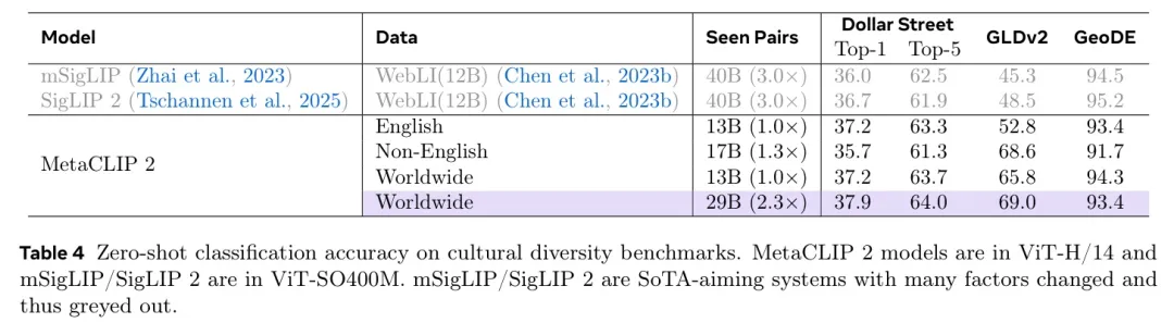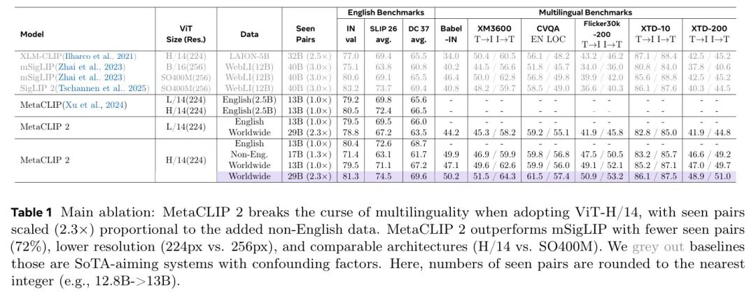 表1 主要消融实验:当采用ViT-H/14时,MetaCLIP 2打破了多语言诅咒,已见数据对比例(2.3倍)随着非英语数据的增加而扩展。MetaCLIP 2在已见数据对较少(72%)、分辨率较低(224px vs. 256px)以及架构相当(H/14 vs. SO400M)的情况下优于mSigLIP。作者灰显那些具有混杂因素、以SOTA为目标系统的 Baseline 。此处,已见数据对的数值四舍五入到最接近的整数(例如,12.8B- 13B)。