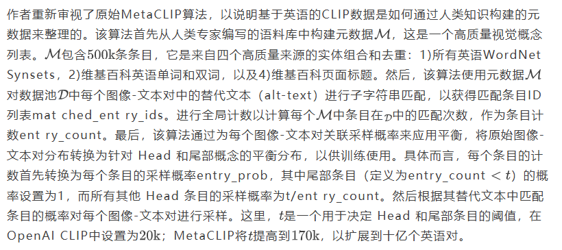1. 元数据。作者将英文MetaCLIP元数据扩展至维基百科和多语言WordNet上的300+种语言。