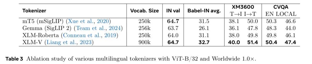为最小化模型架构的改动,作者仅将英语分词器替换为多语言分词器。在零样本基准测试中研究了四种流行的分词器。如表3所示,XLM-V词汇表在英语和非英语领域均表现出最佳性能。