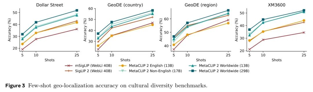 遵循Pouget等人(2024)和Wang等人(2025)的协议,作者在一系列地理多样化的基准数据集上执行零样本分类和少样局部理定位。具体而言,作者在表4中包含了使用Dollar Street(Gaviria Rojas等人,2022)、GeoDE(Ramaswamy等人,2023)和GLDv2(Weyand等人,2020)的零样本分类,并在图3中展示了在Dollar Street、GeoDE和XM3600上的少样局部理定位(Pouget等人,2024)。作者发现,仅将训练数据分布从13B英文对改为13B全局对即可显著提升性能,而扩展到29B全局对则进一步提升了性能,除了GeoDE中性能相当、可能已饱和的表现。图3在评估少样局部理定位时显示了类似的趋势。