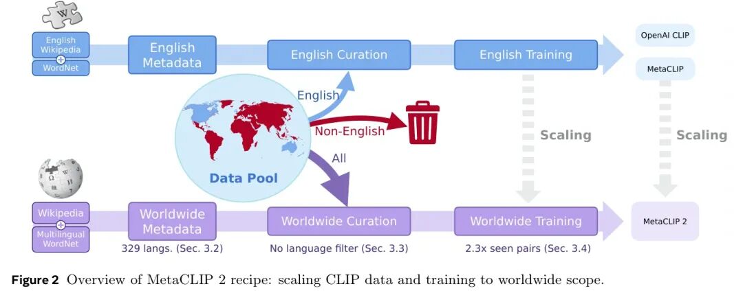 图2 MetaCLIP 2方案概述:扩展CLIP数据并训练至全局范围