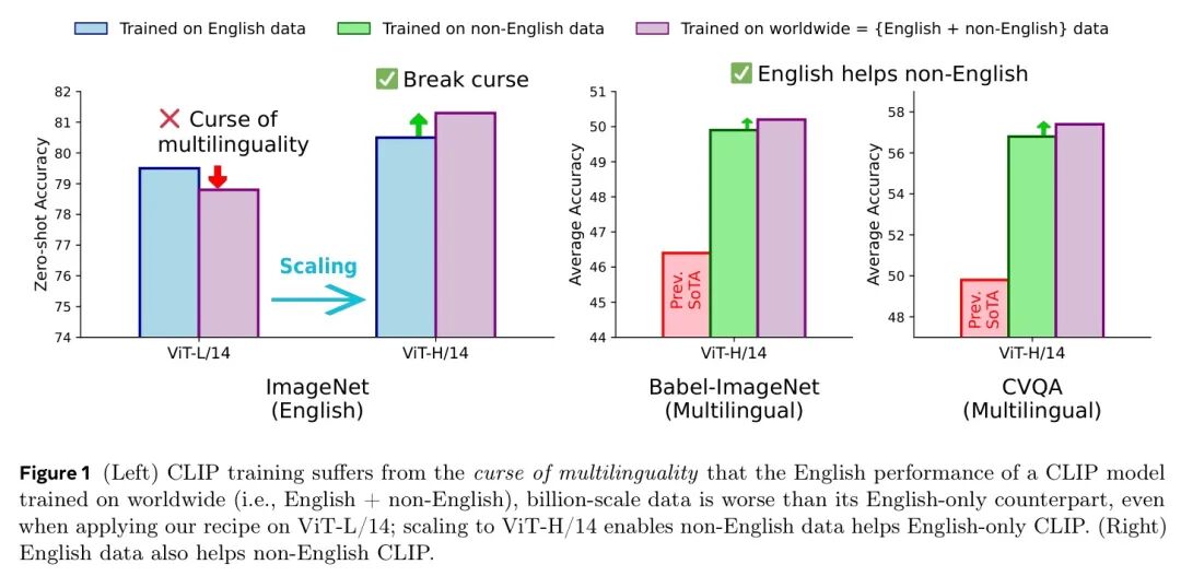 2. 多语言诅咒问题:在全局范围(英语+非英语)数据上训练的CLIP模型的英语性能劣于仅使用英语数据训练的模型。