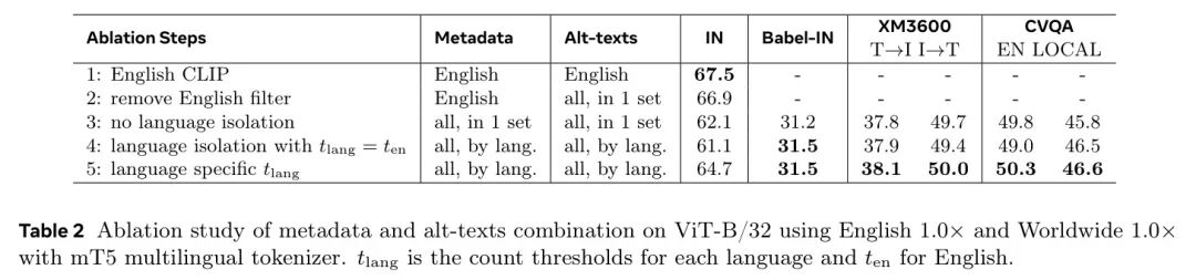作者进一步消融了元数据和策展过程从仅关注英语到其全局对应物的转变,使用ViT-B/32编码器以提高效率。作者在英语和babel-in、XM3600以及CVQA上评估了零样本迁移。如表2所示,从仅英语的CLIP开始,作者首先移除alt-texts上的英语过滤器,以便所有alt-texts都由英语元数据策展,导致IN上下降0.6%,表明在匹配前由LID将文本或元数据分离的英语隔离非常重要。