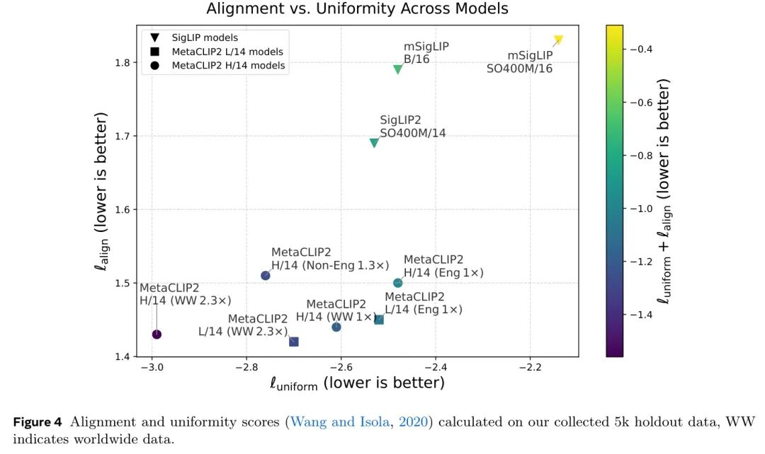 遵循 (Wang and Isola, 2020) 的方法,作者进一步测量了不同CLIP模型中嵌入的质量。为避免来自不同基准的各种未知偏差,作者使用了5k个未用于训练的图像-文本对,并报告了对齐和一致性分数,其中对齐度量图像和文本的相关性,一致性度量图像在视觉编码器嵌入空间中的分布情况。请注意,作者无法控制这5k对是否在其他 Baseline 中被泄露。从图4可以看出,MetaCLIP 2在对齐和一致性方面均表现出良好分数(越低越好),而mSigLIP或SigLIP 2可能在作者收集的保留数据上存在非平凡的偏差。