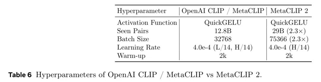 遵循MetaCLIP流程,作者从互联网收集公开可用的图像-文本对。经过LID处理后,大约有的替代文本为英文,这与MetaCLIP仅包含英文数据的规模相当(Xu等人,2024)。为了获得具有泛化能力的配方和发现,作者的训练设置基于OpenAI CLIP的ViT-L/14和MetaCLIP ViT-H/14,除了在Sec. 3.4中描述并在后续小节中排除的使能全局功能所需的变更。详细信息可参见表6和附录B。