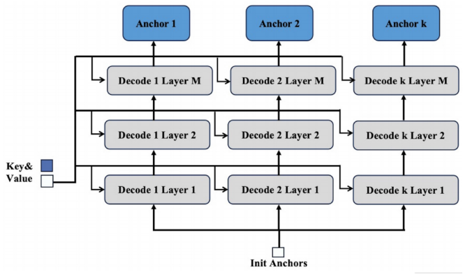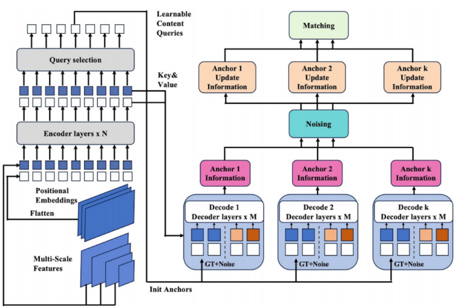 基于解码器的多锚点策略可缓解原始DETR框架的局限性。在DETR架构中,编码器的功能与标准Transformer编码器类似,生成抽象信息以有效将图像划分为多个区域,这些区域被称为查询。为增强这些查询内的目标检测能力,我们引入一个神经网络层,生成与锚点框对应的四维向量(Wang等,2022;Zhang等,2023)。这些向量被视为初始锚点框,提供初步的空间信息,指示潜在的目标位置。