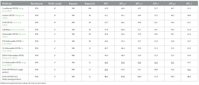 为评估NAN-DETR的性能,我们使用COCO数据集(Lin等,2015)进行评估。该数据集是目标检测研究中广泛采用的综合性基准,涵盖80个目标类别和超过20万个带标签样本。val子集是我们报告检测结果的主要部分。主要评估指标是平均精度(AP),它衡量所有类别在精确率-召回率曲线下的面积平均值。具体指标如AP50和AP75分别对应IoU阈值为0.5和0.75时的平均精度。此外,APS、APM和APL指标评估不同尺寸目标(小、中、大)的性能,深入洞察NAN-DETR应对不同检测挑战的能力。