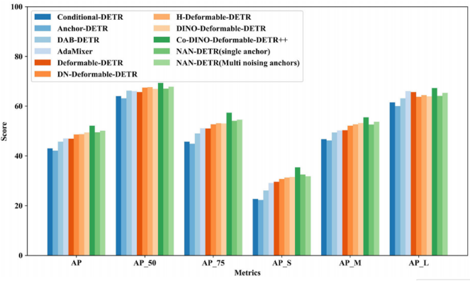 然而,该类别中的最佳表现者是采用多锚点加噪的NAN-DETR,取得了令人瞩目的50.1%的AP。该方法优于所有其他DETR变体,在检测精度上实现了显著提升。CIoU损失也增强了边界框预测,助力获得更高的AP75分数。如图7所示,尽管在小目标检测性能上略有下降,但NAN-DETR在中、大目标检测方面始终表现出色,使其成为应对各类目标检测任务、解决多锚点冲突的灵活且鲁棒的解决方案。从APS和APL的结果来看,中心化加噪机制表现良好,确实在大目标检测中取得了优异成果。