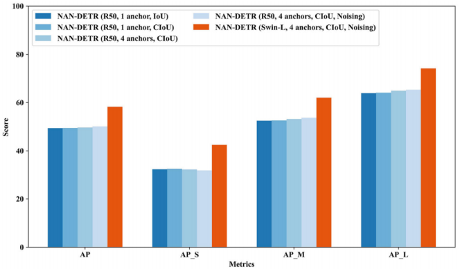 图8的消融研究凸显了NAN-DETR中各组件的贡献。引入无加噪的多个锚点使AP提升至49.7%,证明了我们基于解码器的多锚点策略在提升检测性能方面的有效性。多个锚点使模型能够更好地捕获不同尺寸和形状的目标,从而提高检测任务的精度。