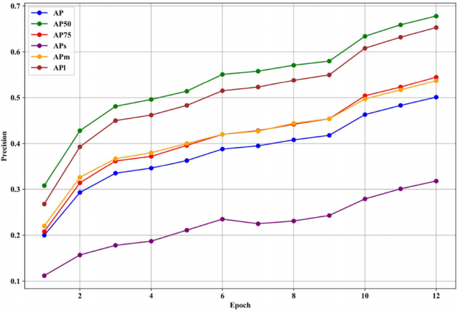 CIoU损失的影响:CIoU损失的使用似乎显著增强了边界框的准确率,尤其是对于较大的目标。CIoU不仅考虑了框之间的重叠,还考虑了宽高比和中心距离,从而带来更精确的预测。这反映在更高的AP75分数上,表明该模型在更严格的IoU阈值下表现更优。