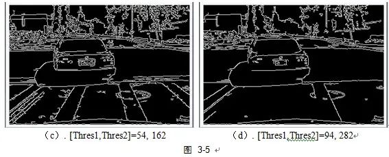 如图 3‑5所示,(a)为原图的灰度图,(b)为高斯滤波平滑图,(c)和(d)分别是手动设置的高低门限值如图所示的canny边缘检测结果。根据多组图像数据测试发现,当canny高低门限值分别设置为50,150时能够保证大部分有效信息的保留且不会有过多冗余信息。因此后文中采用门限值[Thres1,Thres2]= 50,120 作为canny边缘检测参数。Opencv中以下代码实现: