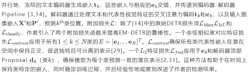 Med-DETR基于多模态DETR[3,14],通过图像和文本嵌入之间的交叉注意力机制实现“语言引导 Query 选择”。作者提出学习特定类别的示例嵌入或特征,这些嵌入或特征还可以用于指导检测。这些示例是根据与各自类别空间位置相对应的视觉特征计算得出的。关注这些特征使检测Head能够执行基于原型的搜索,从而便于扩展到新类别。图1概述了EM-DETR,包括示例生成和额外的损失。此外,EM-DETR采用迭代训练策略。