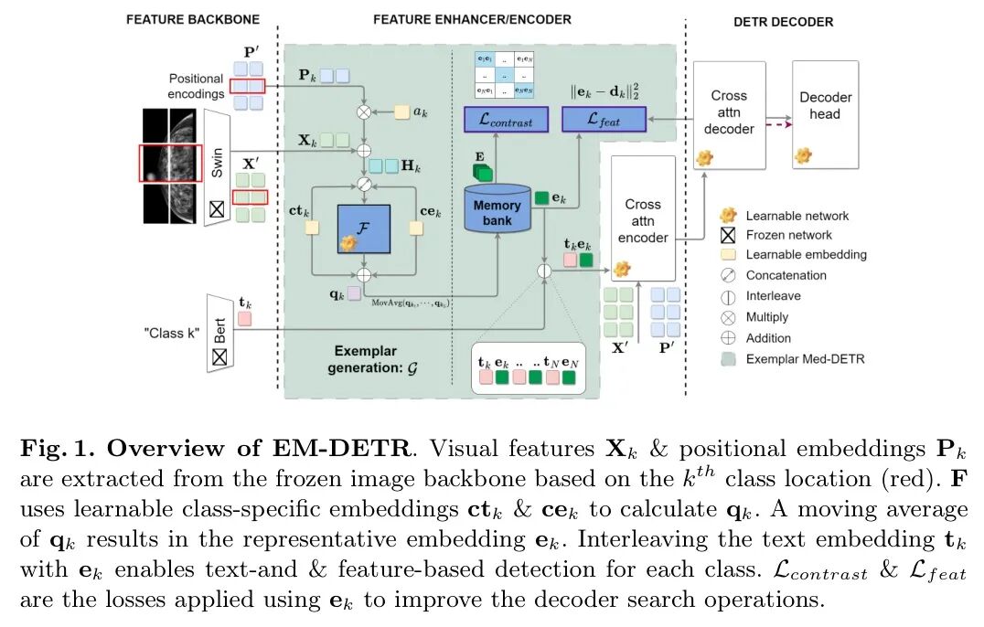 基于多模态数据融合的概念,作者提出了Exemplar Med-DETR,这是一个显著提升密集乳腺钼靶图像病灶检测性能的新型目标检测框架。Med-DETR学习一个特定类别的代表性特征,该特征与视觉和文本输入一起被整合到检测流程中。这些"示例"特征指导检测Head基于"匹配"的类特征,有效地定位乳腺钼靶图像中的病灶。Exemplar Med-DETR(EM-DETR)的有效性依赖于类之间的对比学习方案。这带来了两个主要挑战:区分解剖特征与异常,以及区分紧密相关的类特征。其次,与自然图像中物体类别可以出现在任何位置不同,医学图像中的解剖结构具有固有的对齐性。利用这些见解,EM-DETR引入了一种迭代训练方案,该方案分阶段训练网络,在正常解剖结构和病灶区域之间进行对比。在本研究中,作者在多个公共数据集上对Med-DETR进行了全面评估,并通过一系列消融研究评估了引入模块的影响。