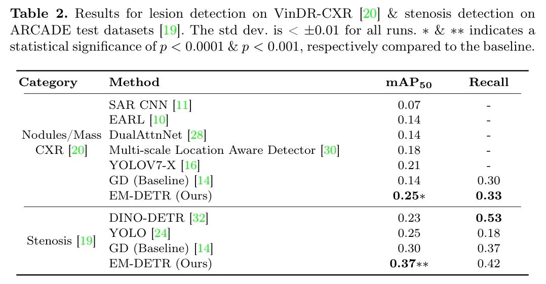 3. 对于胸部X光片,对肿块检测实现了0.25的mAP,提升了4个百分点;对于血管造影,对狭窄检测实现了0.37的mAP,提升了7个百分点