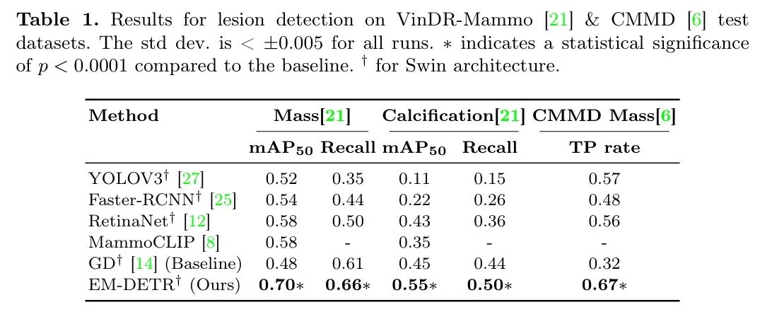Med-DETR在VinDR-Mammo数据集[21]上的肿块和钙化检测均取得了SOTA结果,如表1所示。与之前的SOTA相比,肿块检测的显著提升了12%。如图2(a)所示,即使在极其致密的乳腺组织中,预测结果也与真实标签gt紧密对齐。同样,钙化检测结果相对于SOTA提升了20%。尽管取得了显著进步,作者仍调查了较低的情况。作者发现钙化通常与肿块共存,并被标注为同一个边界框。Med-DETR依赖于特征匹配,而这些标注影响了作者的结果,导致预测结果与真实标签gt不完全匹配,如图2(b)所示。在第一张钙化图像中,模型准确预测了钙化区域,而未包含较大的肿块。然而,在第二张图像中,由于中特征提取的不一致性,模型将肿块包含在预测区域内。为了评估肿块检测的分布外(OOD)性能,作者使用先前在VinDR-Mammo[21]肿块图像上训练的模型,并在CMMD[6]上进行测试。由于缺乏精确的边界框标注,并基于实际临床相关性,作者考虑将真阳性(TP)率作为评估指标。如果真实标签gt中心位于高于0.1阈值的最高分数预测框内,则检测被视为TP。根据此标准,与 Baseline 相比,作者实现了绝对提升35%,如表1所示。在图4中,作者观察到 Baseline 与EM-DETR之间三个肿块检测实例,以及用黄色 Token 的真实标签gt。对于此测试,作者使用存储在内存库中的示例,这些示例是在VinDR-Mammo数据集上训练时为肿块检测计算的。作者观察到EMDETR能有效识别OOD致密乳腺图像中的异常区域。显著的改进源于模型推理肿块数据集无关的显著特征的能力。