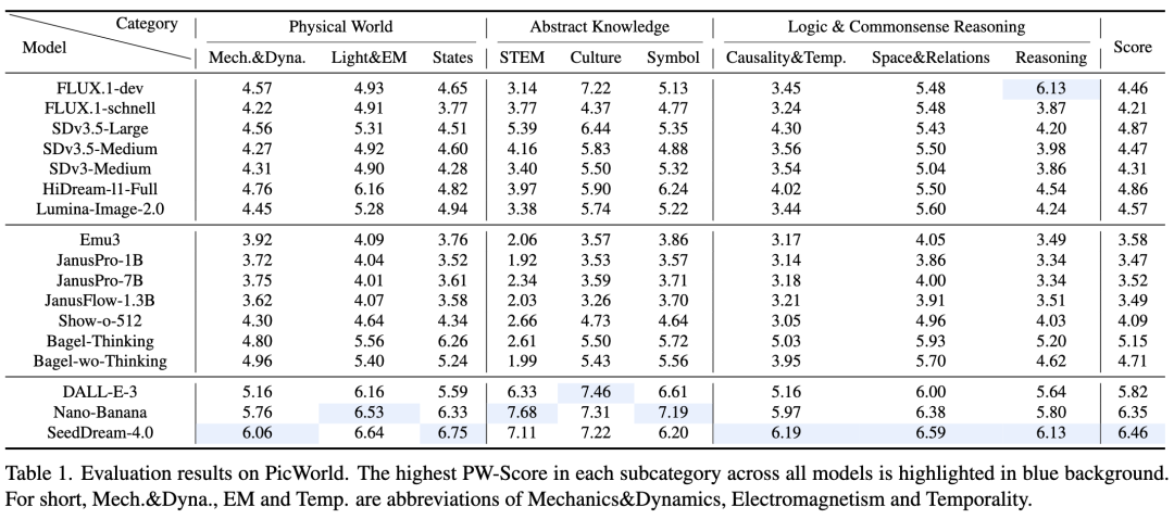 开源统一多模态模型的表现明显低于领先的扩散模型:如 Emu3 和 JanusPro 系列等自回归模型在 PicWorld 基准测试中通常处于较低的性能层级。这可能表明在模型的通用性与高保真物理模拟的专业能力之间存在权衡。