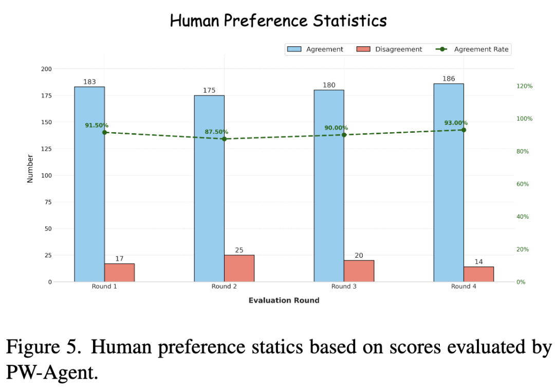 与人类评估者的一致性:如下图 5 所示,通过人类研究(3位资深工程师,成对比较),PW-Agent 与人类偏好的一致率达到 **90.5%**,表明其能有效辨别图像质量和物理合理性的细微差别。