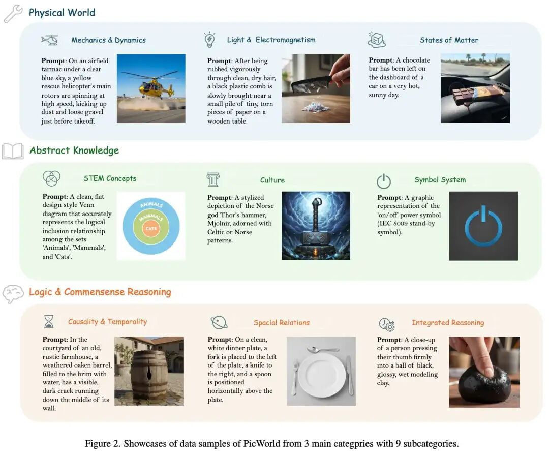 PicWorld基准:提出了第一个用于系统评估文生图模型隐含世界知识掌握程度和物理因果推理能力的综合基准。它包含1,100个提示词,涵盖三个核心类别: