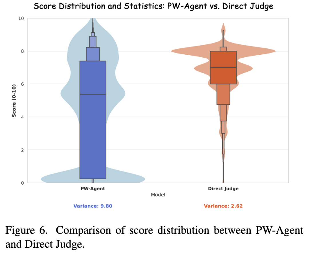 如下图 6 所示,直接评判表现出强烈的集中趋势偏差(分数分布压缩),而 PW-Agent 利用了完整的评分范围,具有更高的方差和区分度。