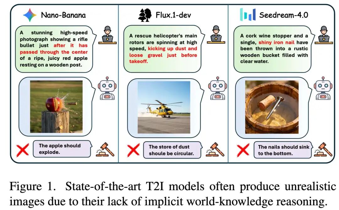 核心能力缺失:当前文生图模型缺乏对隐含世界知识和物理因果推理的理解。它们能生成逼真且符合指令的图像,但在需要常识和逻辑推理的提示词上经常失败。