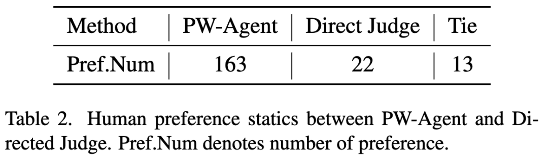 人类评估者在 81.5% 的情况下倾向于 PW-Agent 的评分和推理(如下表 2 所示)。