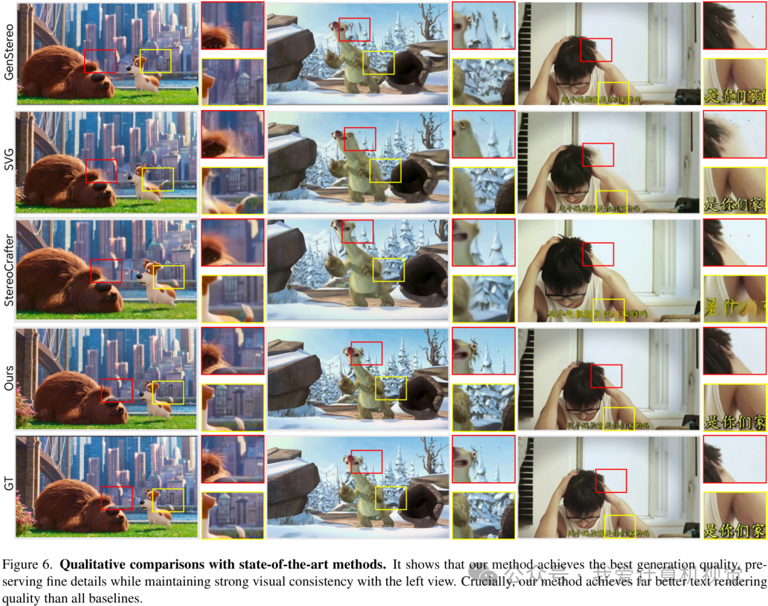 从定性对比来看,无论是细节保留、与左眼的视觉一致性,还是非常考验模型能力的文字渲染,StereoWorld都全面优于之前的方法。