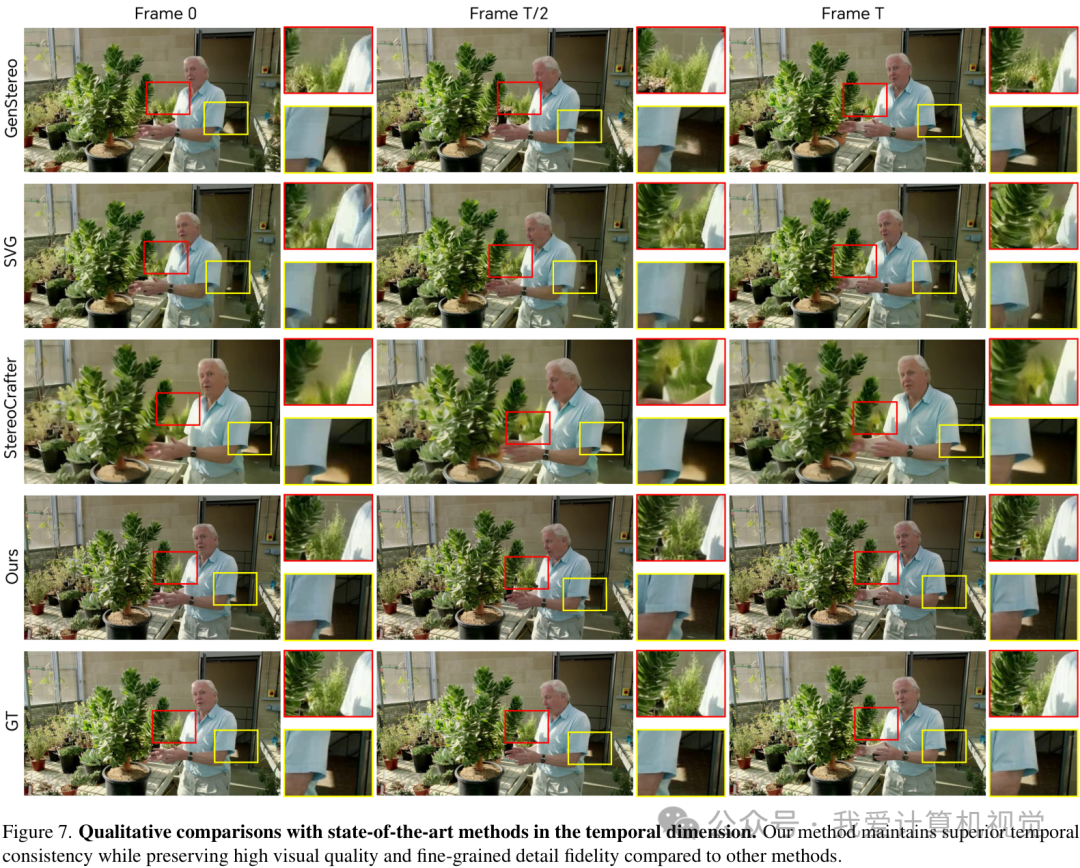 在时间维度上,其他方法可能会出现闪烁或不稳定的情况,而StereoWorld则保持了卓越的时间一致性,画面流畅自然。