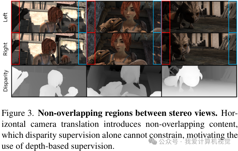 然而,只靠视差监督还不够。因为当相机水平移动拍摄左右眼视图时,总会有一些区域只在其中一个视图中可见,我们称之为“非重叠区域”。视差只能处理重叠的部分,对这些新出现的区域就无能为力了。
