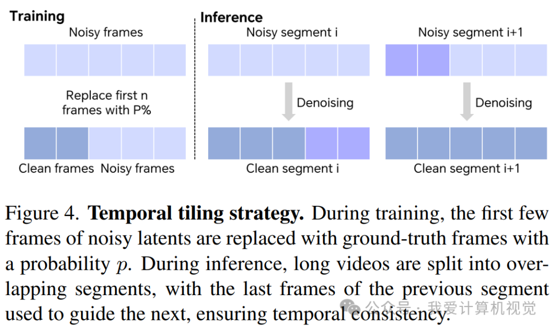 时间切片:对于长视频,同样是切分成带重叠的片段。前一个片段的最后几帧会被用来引导后一个片段的生成,像接力一样,保证了时间上的连贯性。