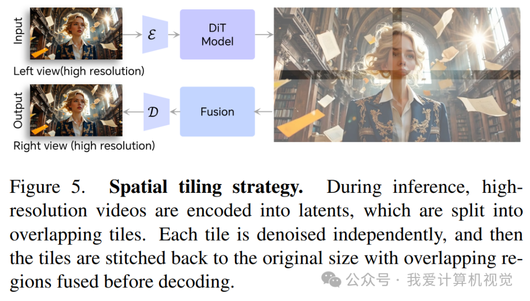 空间切片:对于高分辨率视频,先将其编码到隐空间,然后切成带重叠的小块。每个小块独立进行去噪生成,最后再拼接融合起来。这样就实现了高效的高分辨率合成。