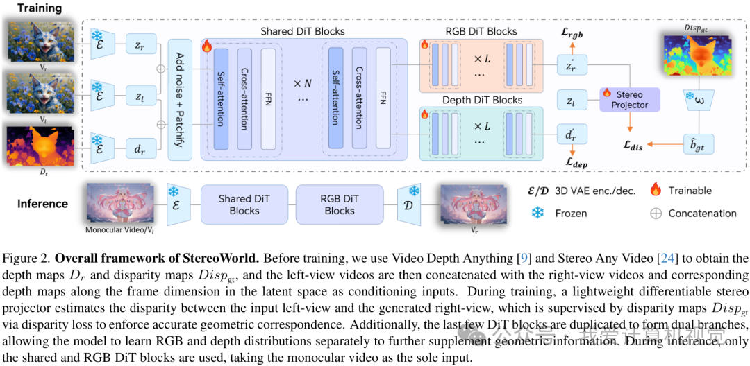 StereoWorld则另辟蹊径,它认为不应该将生成过程割裂开,而是要让模型在生成右眼画面的同时,就直接“感知”到3D几何结构。