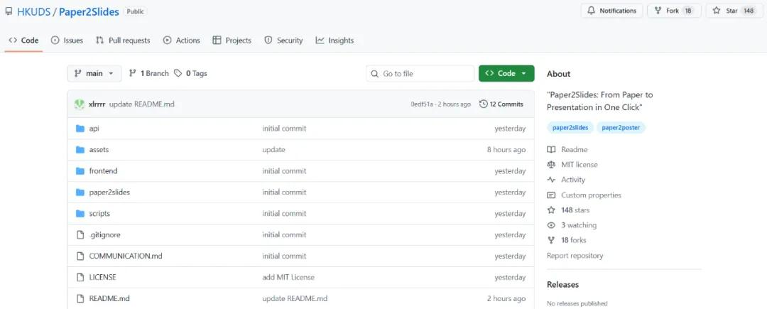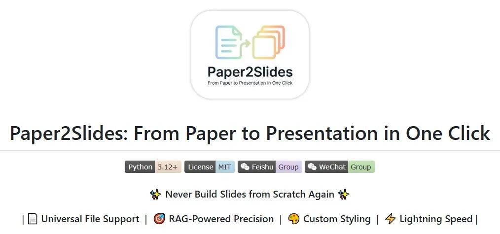 香港大学数据智能实验室突然在GitHub上开源了一款名为Paper2Slides的工具,短短两个月内,这个项目就收获了148个星标和18次分支 Fork,科研圈的开发者们都在讨论:这个工具真的能终结熬夜做PPT的痛苦吗?