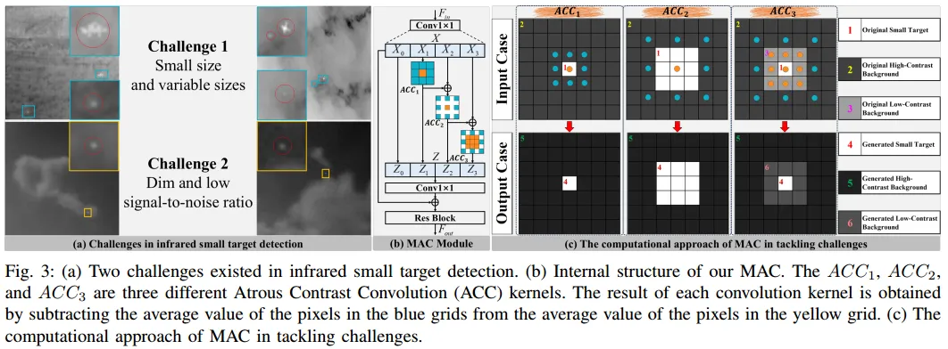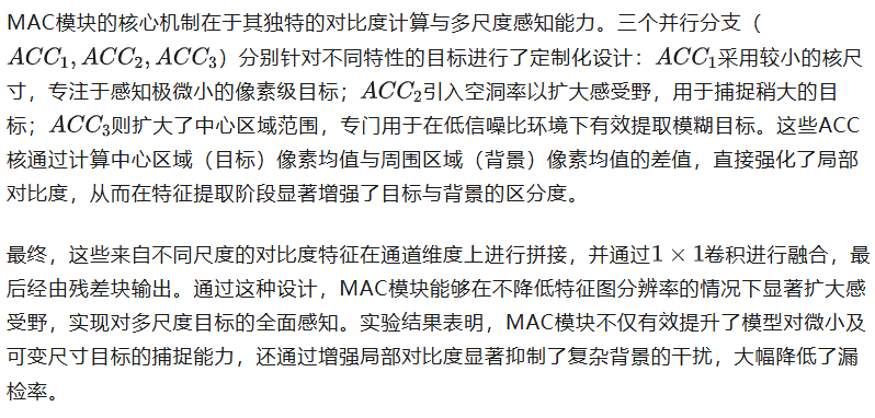 多尺度空洞对比卷积(MAC)模块是专门针对红外小目标尺寸多变(从单像素到数十像素不等)以及信噪比低、外观模糊的挑战而设计的。为了克服传统CNN方法在处理纹理信息贫乏的小目标时容易丢失信息的缺陷,MAC模块在空间域编码器中引入了创新性的并行结构。该模块首先通过1X1卷积扩展输入特征图的通道维度,并将其分为四组:一组作为直接连接以保留原始信息,其余三组则分别输入到三个具有不同核大小和空洞率的空洞对比度卷积(ACC)分支中进行并行处理。
