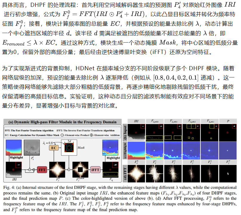 动态高通滤波器(DHPF)模块是 HDNet 频率域分支的核心组件,旨在解决现有频率域方法依赖固定阈值或简单卷积,难以适应红外图像中复杂多变的低频背景这一问题。红外图像通常包含大面积缓慢变化的低频背景(如云层、路面)和稀疏的高频目标细节。DHPF 不使用静态滤波器,而是根据图像内容的频率能量分布,动态地生成滤波掩膜,从而实现自适应的背景抑制。