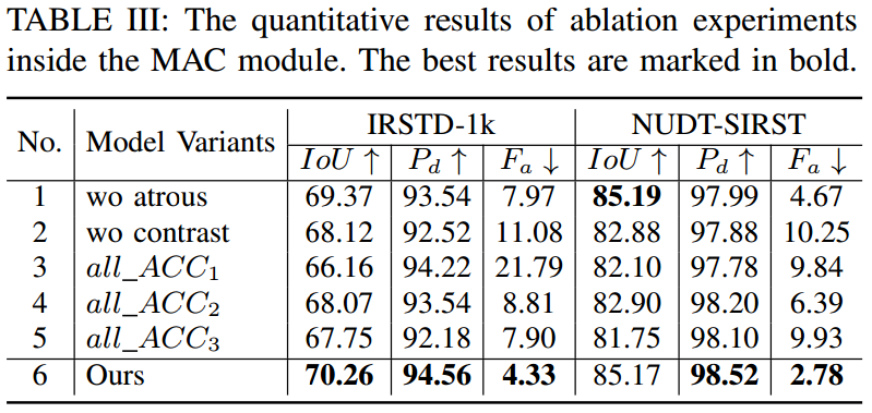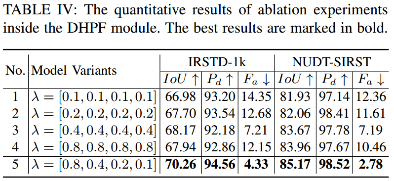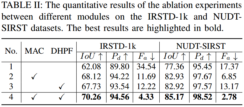 消融实验系统性地验证了HDNet中每个核心模块的有效性与必要性。实验表明,单独的MAC模块显著提升了对多尺度小目标的感知能力,单独的DHPF模块有效抑制了低频背景干扰;而当两者结合构成完整HDNet时,各项性能指标达到最优。模块内部的对比实验进一步证实,多尺度空洞对比设计、动态渐进滤波策略以及尺度位置敏感损失函数均为提升模型整体性能的关键创新点。