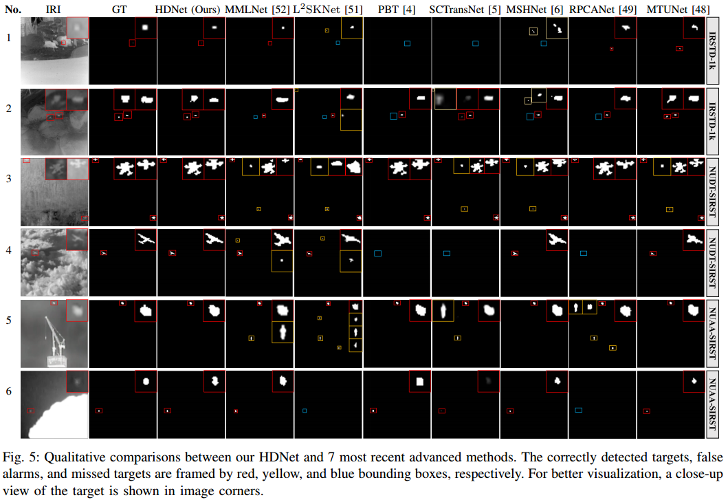 HDNet 在多个数据集上的关键指标显著领先,在 NUAA-SIRST 数据集上实现了 100% 的目标检出率,并在所有数据集上保持了最低的虚警率,验证了其在复杂背景下准确检测多尺度小目标的强大能力。